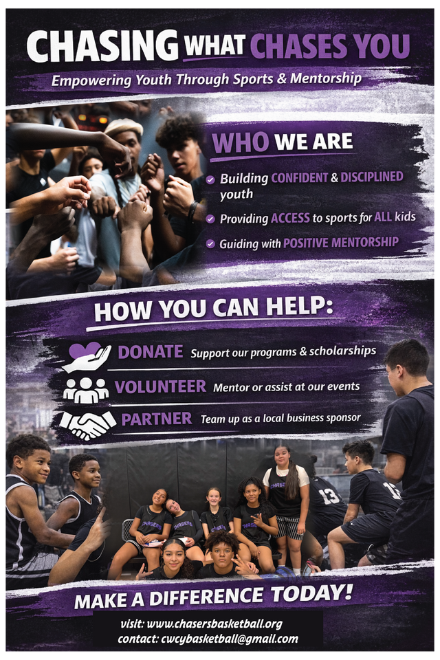 Chasing What Chases You is a non-profit organization that houses youth sports. We are helping raise funds so athletes can afford the program. Thank you for all of your support. Please visit chasersbasketball.com